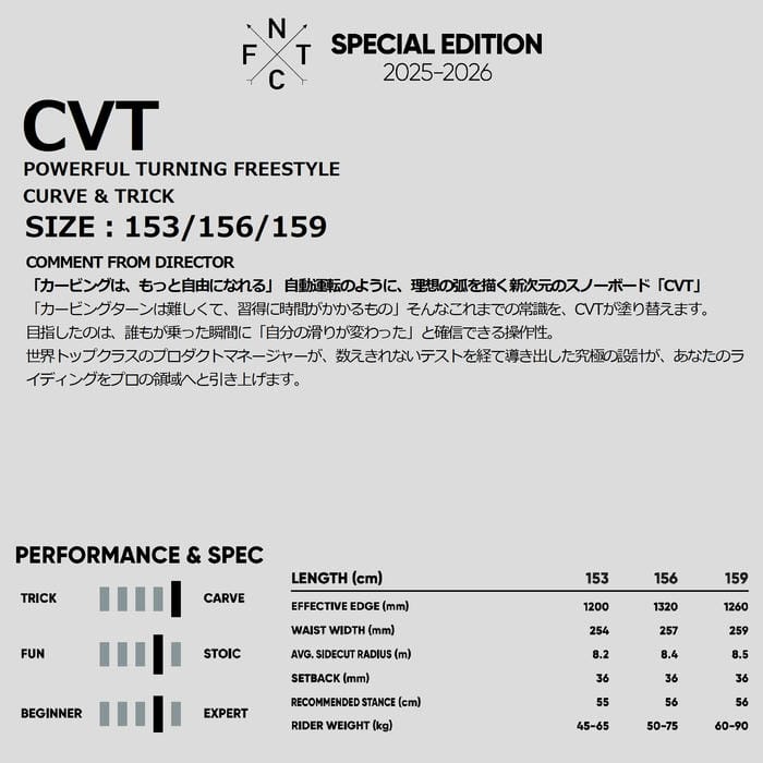 定価:85000+(税)サイズ153 , 156 , 159モデルCVT商品説明「カービングは、もっと自由になれる」 自動運転のように、理想の弧を描く新次元のスノーボード「CVT」