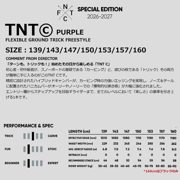 定価:65000+(税)サイズ139 , 143 , 147 , 150 , 153 , 157カラーPURPLE商品説明「ターンも、トリックも!」始めたその日から楽しめる「TNT C」