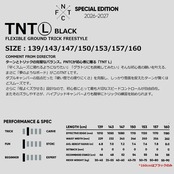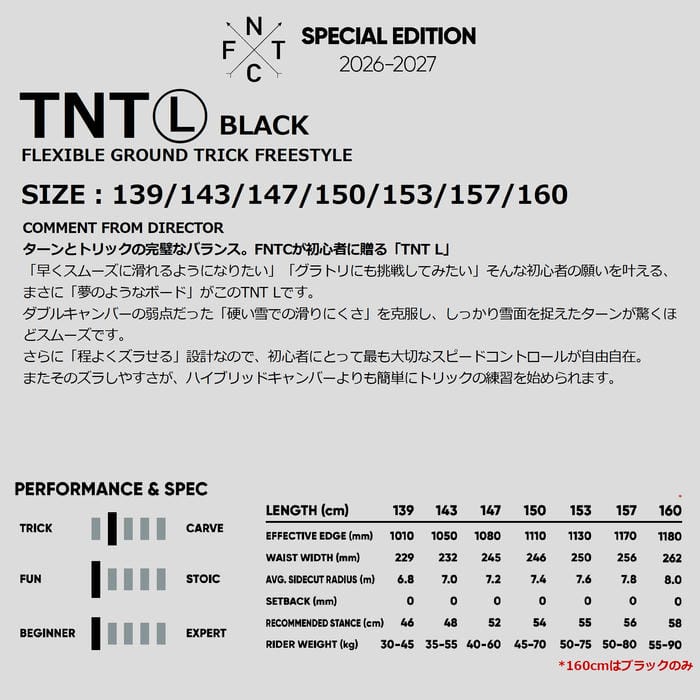 定価:65000+(税)サイズ139 , 143 , 147 , 150 , 153 , 157 , 160カラーBLACK商品説明ターンとトリックの完璧なバランス。FNTCが初心者に贈る「TNT L」