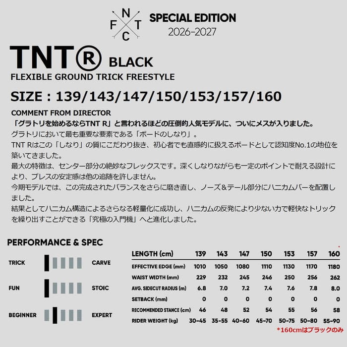 定価:65000+(税)サイズ139 , 143 , 147 , 150 , 153 , 157 , 160カラーBLACK商品説明「グラトリを始めるならTNT R」と言われるほどの圧倒的人気モデルに、ついにメスが入りました。
