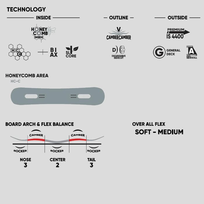 結果としてハニカム構造によるさらなる軽量化に成功し、ハニカムの反発により少ない力で軽快なトリックを繰り出すことができる「究極の入門機」へと進化しました。形状Vダブルキャンバー選べる 特典・プレチューン/WAX FUTUREサービス