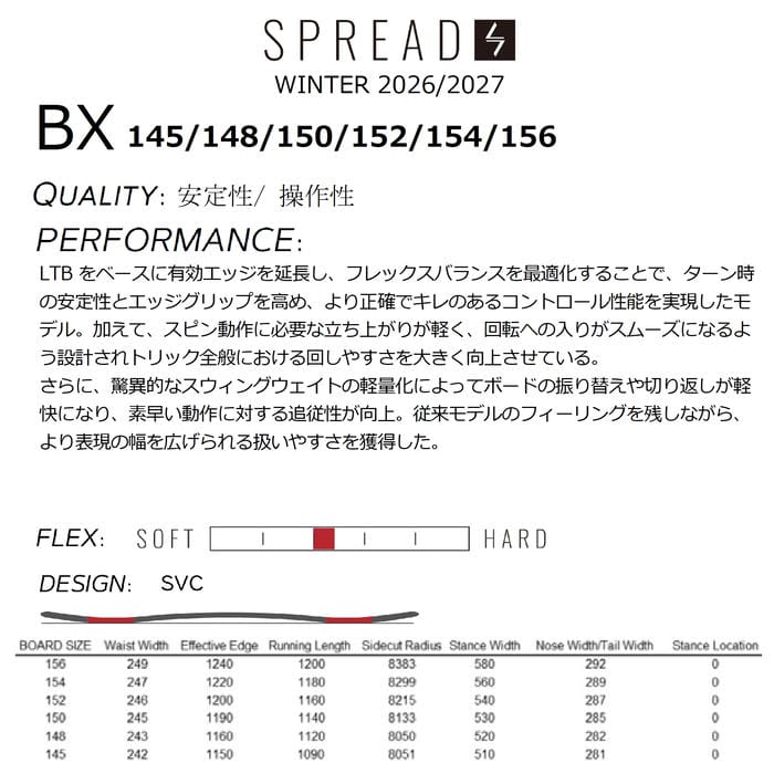 26-27 SPREAD BX 145/148/150/152/154/156 SVCモデル 可変キャンバー フリーラン スノーボード 尾川慎二 板 グラトリ ジブ レッツトライ スプレッド 2027 正規品