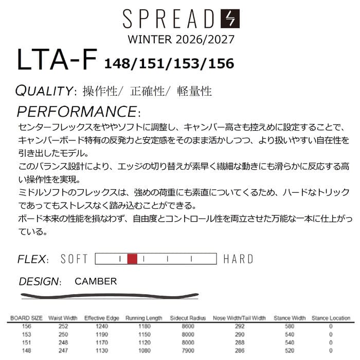26-27 SPREAD LTA-F 148/151/153/156 キャンバーモデル フリーラン 国産 スノーボード 尾川慎二 板 グラトリ ジブ レッツトライ スプレッド 2027 正規品