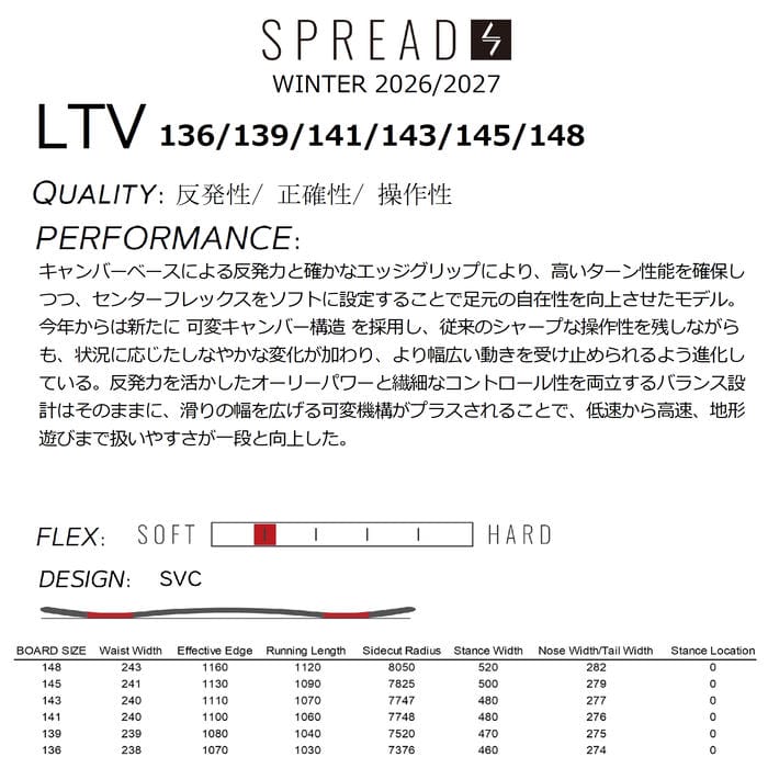 26-27 SPREAD LTV 136/139/141/143/145/148 SVC 可変キャンバー フリーラン スノーボード 尾川慎二 板 グラトリ ジブ レッツトライ スプレッド 2027 正規品