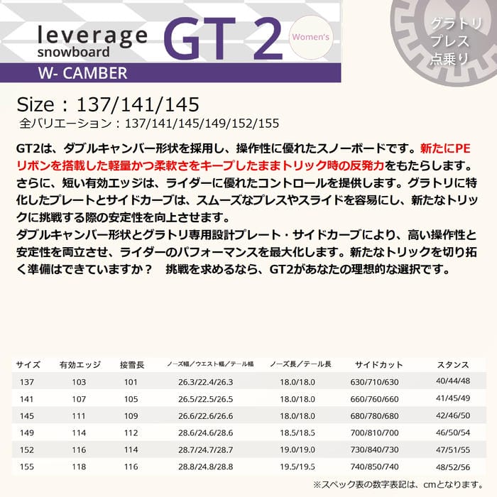 26-27 leverage GT2 137/141/145 ダブルキャンバー グラトリ専用ボード プレス 点乗り トリック レディース 国産 レバレッジ スノーボード 板 2027モデル 正規品