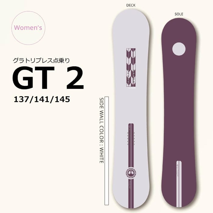 定価:83000+(税)サイズ137 , 141 , 145モデルGT2商品説明GT2は、ダブルキャンバー形状を採用し、操作性に優れたスノーボードです。新たにPEリボンを搭載した軽量かつ柔軟さをキープしたままトリック時の反発力をもたらします。