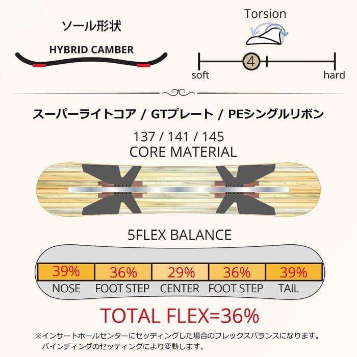 トリックに欠かせないトーションの使いやすさやノーズテールの絶妙なフレックスなど全てのバランスが究極に最適化され、プレス、弾き、ラン、何をとっても妥協のないパフォーマンスを生み出せる最高峰のグランドトリックボードがこのGT3だ。形状ハイブリッドキャンバー選べる 特典・プレチューン/WAX FUTUREサービス