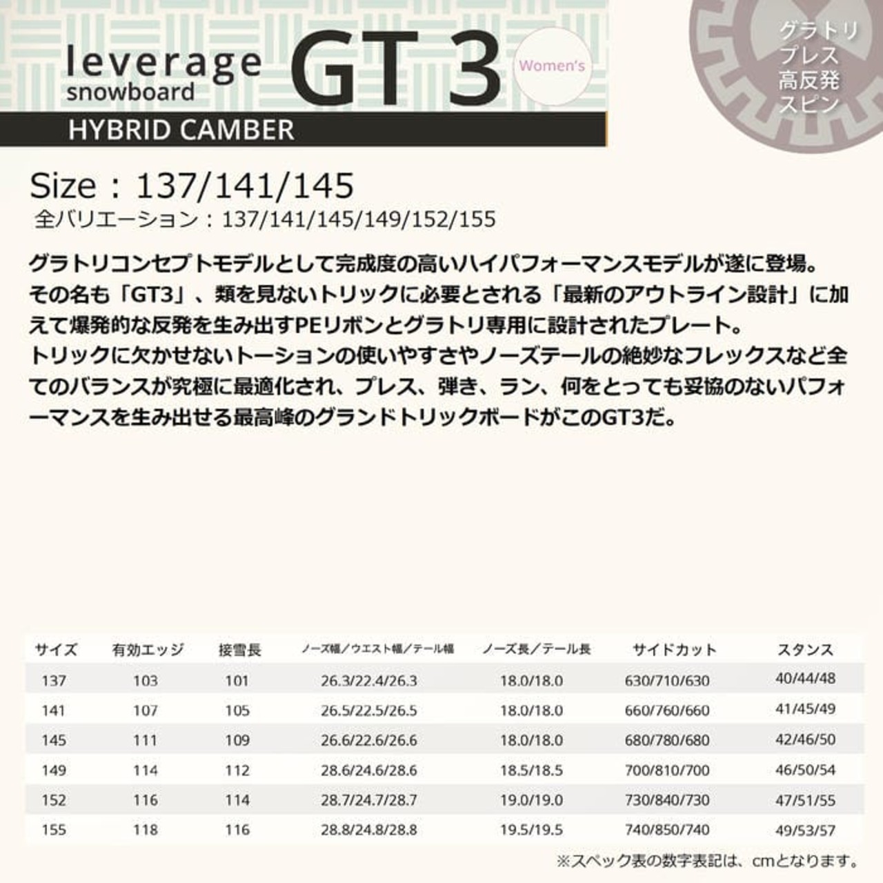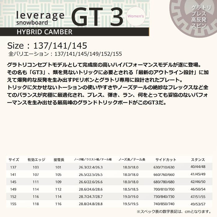 26-27 leverage GT3 137/141/145 ハイブリッドキャンバー グラトリ専用ボード プレス 弾き ラン スピン レディース 国産 レバレッジ スノーボード 板 正規品