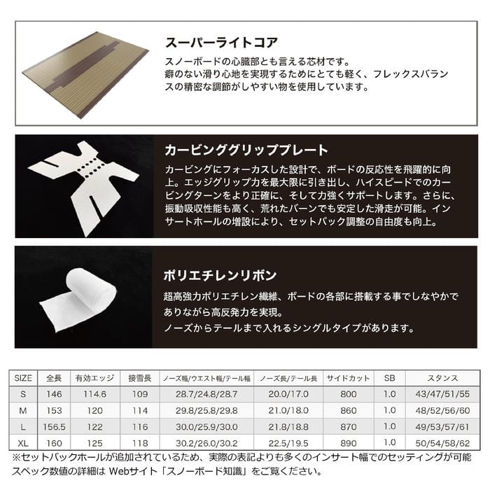 それは“体格”ではなく、“スピード”や“遊ぶフィールド”でボードを選ぶという新しい考え方。カービングで切り込みたいのか、ツリーで遊びたいのか。スタイルに合わせて最適な長さを選べる構成です。形状キャンバー選べる 特典・プレチューン/WAX FUTUREサービス
