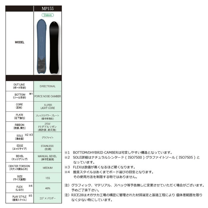 26-27 RICE28 MP 155 フォースノーズキャンバー ディレクショナル モーグルパウ コブ パウダー ユニセックス 国産 スノーボード 板 ライストゥエンティーエイト 正規品