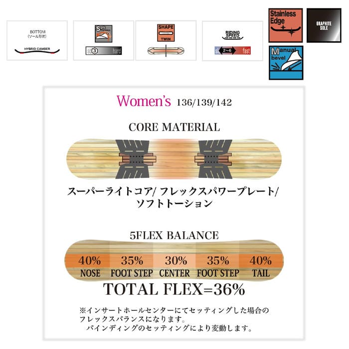 トリック時の扱いやすさと、滑走中の安定感を高次元で両立した1本に仕上がっています。形状ハイブリッドキャンバー選べる 特典・プレチューン/WAX FUTUREサービス