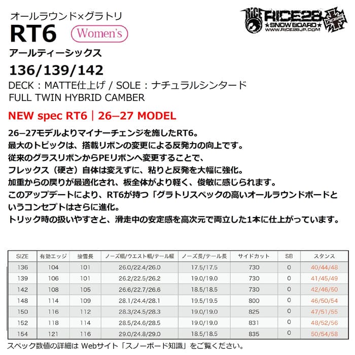 26-27 RICE28 RT6 ハイブリッドキャンバー フルツイン オールラウンド グラトリ レディース 国産 スノーボード 板 ライストゥエンティーエイト 正規品
