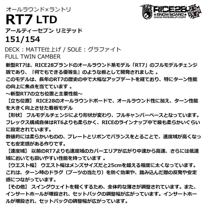定価:110000+(税)サイズ151 , 154モデルRT7_LTD商品説明新型RT7は、RICE28ブランドのオールラウンド系モデル「RT7」のフルモデルチェンジ版であり、『何でもできる優等生』のような板として開発されました 。