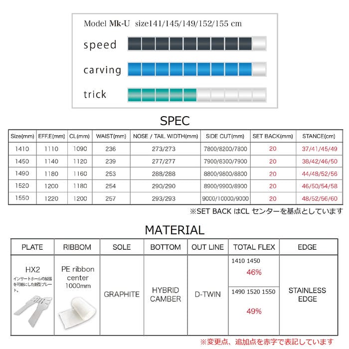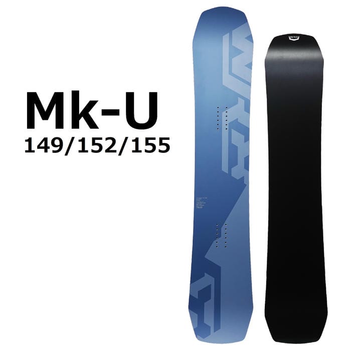 定価:123000+(税)サイズ149 , 152 , 155モデルMk-U商品説明Mk-U は「ボードの硬さに依存しないカービングボード」という新しい提案として開発されたモデルです。今回のマイナーチェンジでは、フレックスバランスを微調整し、より一貫性のある操作性と安定感を追求しました。