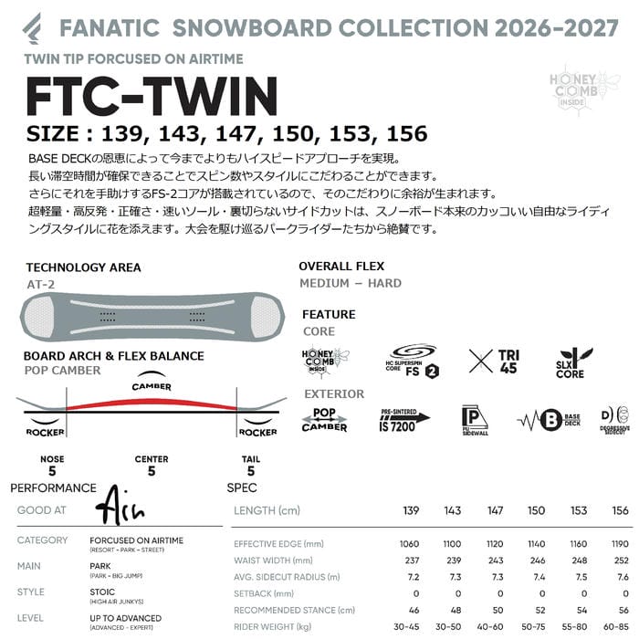 26-27 FANATIC FTC-TWIN 139/143/147/150/153/156 ポップキャンバー ツインチップ エアー パーク ファナティック エフティーシーツイン スノーボード 板 正規品
